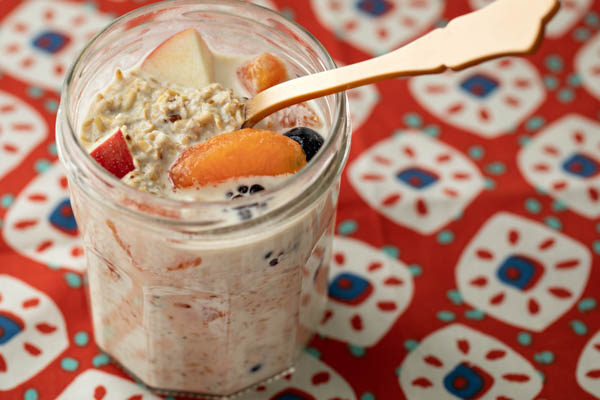 Homemade almond milk, raw toasted oats, and fresh fruit create a breakfast that greets you in the morning. Pictured here with Pink Lady apples, Cara Cara orange fillets, blueberries, and blackberries.