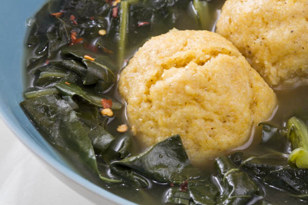 Collards braised gently in a smoky broth give fine cornmeal dumplings a soft place to land. The dumplings are light and graceful with stunning corn flavor.