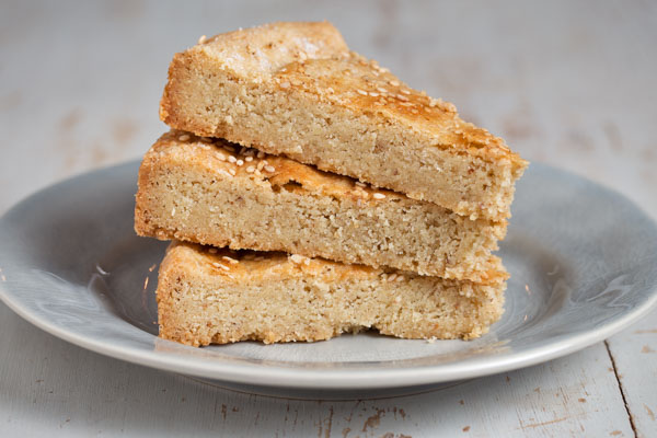Confession: We have a little love affair going with benne seeds and pecans. We also have a trace of Southern sweet tooth, and adore the classic shortbreads served in old Charleston with tea and madeira. Here we find magic in bennecake flour, milled from dried benne hulls expressed for oil, and fresh ground pecans in a classic shortbread formula. We didn’t anticipate the stunning effects of this combination: bright and toasted nuttiness shining through light caramel richness. And chew! The bennecake creates chewiness that departs from the dependable shortbread form—with wisps of super fine melting beach sand texture on the finish. Here’s to a chewy-crisp tribute to fall!