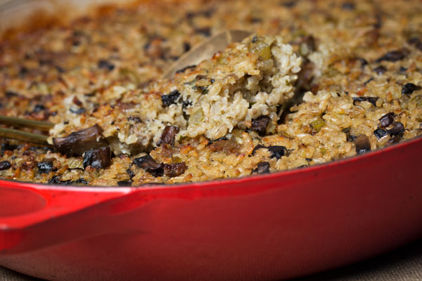 Roasted turkey stuffing should evoke rural field habitat, autumn scents of herb and spice, moist earth, fallen leaves, and wild grass. But what about stuffings that distend their pleasures beyond “pleasantly full” to dumbstruck? This year we considered how a stuffing might take its cue from the decades-deep American trek toward lighter fare and do the honors without the bulwark of bread. Enter Charleston Gold Brown Rice, stage left, which lightens the arrangement and curries new flavors, while retaining all the fine character and disposition of a traditional bread stuffing. Excellent, too, straight from a fork at the fridge ’round midnight.