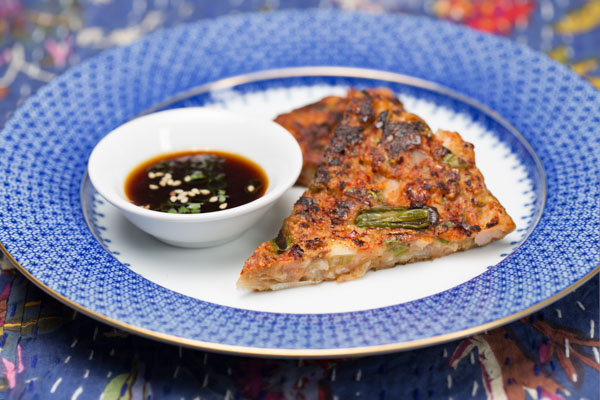 Even those who, like my husband, Glenn, cannot bear the intermittent ambient aroma of fermenting kimchi, and enjoy kimchi only as the smallest possible flavor accent to be visited on a side dish, love these pancakes. They have the requisite crispness any pancake craves, and just enough gooeyness to bind the semi-crunch of the kimchi and the bounce of chopped shrimp. Made with our rice and bread flours that temper the kimchi’s sharpness while allowing its heat and ferment flavors to come through, these pancakes reveal long, long back-action flavor—the gustatory equivalent of a dog barking in the distance.
