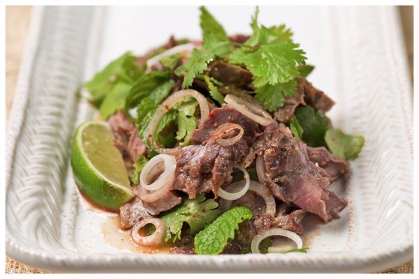 A mesmerizing bricolage of flavors, textures, and sensations collide in this grilled beef dish: abundant hot spice and piquant lime juice, Thai fish sauce’s signature je ne sais quoi, the green metallic tang of cilantro, bracing mint, scallion rings, and toasted ground rice—all drip and pool their way around slices of grilled rare skirt steak. You keep eating it in wonderment while making furtive passes at the rice bowl.