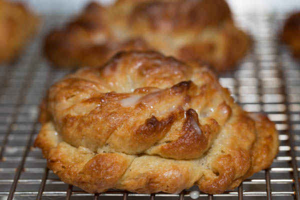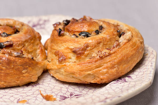 Round and round we go, these snails are rolled up with rum-soaked currants, toasted pecans, and the Danish frosting called remonce. They get a light sugar glaze.