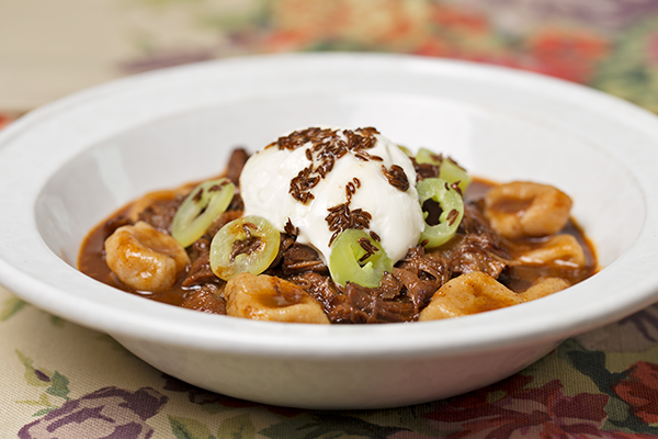 Let’s start with a Hungarian stew of alphabet letters seasoned with accent marks, and a second stew in a pot with just three ingredients: water, meat, and onions. As it evolved, “goulash” absorbed the culture of wild and domestic meats, caraway, paprika, peppers, tomatoes, potatoes, noodles, sour cream, gherkins, and the like, becoming more like the Hungarian language by the decade. By the 19th century, as its ingredients swirled across Western Europe, “goulash” had garnered new names and identities. In present-day Hungary, as many as five or six different dishes possess similar elements and different names. Our retread of this ancient, rural original goes “restaurant urban” using short ribs, shallots, and wine, but finishes with decidedly old-school hand-wrought soup dumplings called csipetke. The semolina we used in the csipetke reflects the ancient wheat culture of central Europe. Goulash it is not, but it will soothe your soul on a wintry evening just the same.