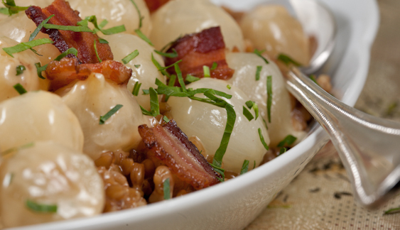 In this case, we resolved to move fresh, hand-peeled pearl onions from the fringes of a meal to a more prominent position on the plate. The side dish that evolved combines Anson Mills Farro Piccolo cooked in homemade beef stock and port wine, with creamed pearl onions and artisanal bacon. The supporting ingredients, with their bright and dark contrasting flavors and texture—the explosive pop of farro, the flavor dimension of rich beef stock, and bacon’s crisp smoke and fat—work beautifully with the sweetness of the onions and suaveness of the cream. This might be our favorite farro dish to date, an outstanding accompaniment to holiday classics like standing rib and crown rack roasts. It makes a couple of grilled steaks feel very lucky as well.