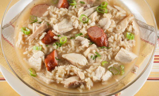 Day two: Using a spoon, lift the congealed fat from the surface of the broth and discard the fat. Return the stock to the pot, set the pot on the stove, stir in the reserved chicken meat and the sausage, and bring to a simmer, covered, over medium-high heat. Reduce the heat to low and stir in the rice, pepper, and salt to taste. Continue to simmer very gently, uncovered, stirring occasionally, until the rice is tender the broth has thickened, about 25 minutes. The stew should be thick but not dry, and the grains of rice should be full but not exploded.