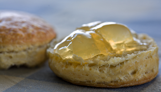 Light yeasted biscuits under the stained-glass glow of scuppernong jelly.