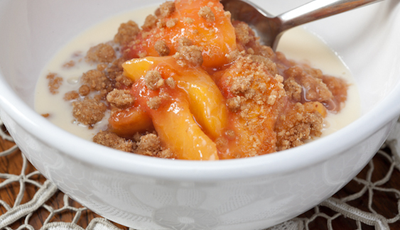 Bake the peaches until bubbling and the sauce around them is has reduced and thickened, about 20 minutes. Sprinkle the streusel over the fruit and bake 5 minutes more. Remove from the oven and let the crisp cool for 15 minutes. Serve warm with cold milk or vanilla ice cream.