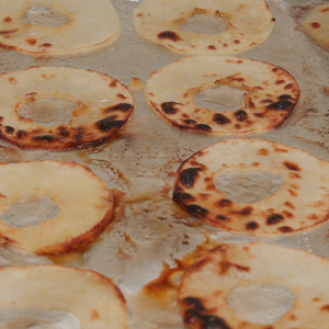 Roast the apples: Adjust an oven rack to the highest position and heat the broiler. Line 2 or 3 baking sheets (depending on how many you have) with aluminum foil and brush them with melted butter. Peel and core the apples one at a time and coat each one with lemon juice. Using a mandoline, slice the apples into rings about 1/16 inch thin. Lay the rings in a single layer on the prepared baking sheets, about 20 slices per pan. Sprinkle the apples with sugar and broil one baking sheet at a time until the apples are soft, spotty brown, and fragrant (fig. 4.1), 2 to 2½ minutes, rotating the baking sheet halfway through. Using a thin metal spatula, transfer the apple slices immediately to a fresh sheet of aluminum foil or parchment paper (otherwise they become glued to the foil as they cool).