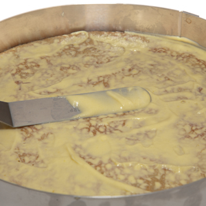 Assemble the crêpe cake: Line a baking sheet with parchment paper. If you are using an 8-inch-diameter, 1½-inch-high entremet ring, fit an 8-inch cardboard cake round into the bottom and set the ring on the baking sheet. If you are using an 8-inch cake pan, coat it lightly with vegetable oil spray and line the bottom with a parchment paper round. Trim any straggly or oversized crêpes with scissors. Place a crêpe in the bottom of the ring or cake pan; if you are using a cake pan, make sure to lay the first crêpe lacy side down as it will ultimately be the top layer of the cake. Using a small offset spatula, spread a thin layer of pastry cream over the crêpe. Lay a second crêpe on top. Spread the second crêpe with a thin layer of cream (fig. 6.1), and then arrange a layer of apple slices on the cream (fig. 6.2). Repeat this pattern, spreading pastry cream on every crêpe layer and arranging apple slices on every other. Ultimately, there should be 6 layers of apple slices. The top two layers of the cake should be crêpes and pastry cream only; do not spread pastry cream on the final crêpe layer.