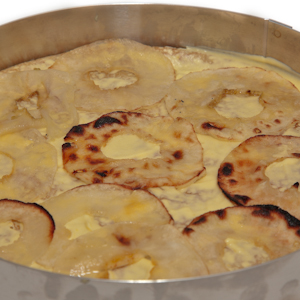 For this recipe, you will need a fine-mesh sieve; a deep, narrow bowl; a medium mixing bowl; a whisk; a small heavy-bottomed saucepan; a wooden spoon; a rubber spatula; a medium saucepan; a small pitcher or liquid measuring cup; two or three baking sheets; aluminum foil; a pastry brush; a peeler; an apple corer; a mandoline slicer; a thin metal spatula; parchment paper; an 8-inch-diameter, 1½-inch-high entremet ring mold or an 8-inch round cake pan; an 8-inch cardboard cake round; kitchen scissors; a small offset spatula; a long metal spatula; a propane or butane torch; and an electric or serrated knife for slicing the cake.