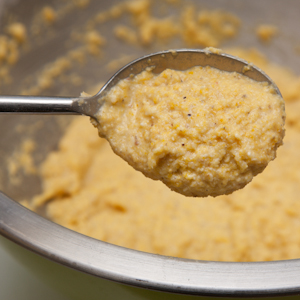 Crack the egg into a small bowl and whisk to combine. Whisk in the baking powder, and then stir in the grated onion. Turn the egg mixture into the moistened cornmeal and stir with a wooden spoon to combine. The batter will be fairly thick, but should drop shaggily from a spoon (fig. 3.1); if it is thin or droopy, stir in additional cornmeal until the proper consistency is reached.
