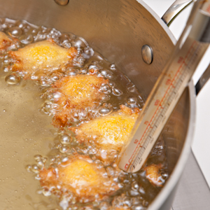 For this recipe, you will need a small saucepan; a large mixing bowl; a 4-quart Dutch oven, a deep, heavy-bottomed saucepan or an electric deep-fat fryer; a deep-fry thermometer that can be attached to the sides of a pan; a pair of tongs; and a slotted spoon.