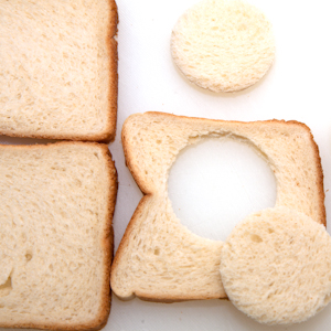 Start the garlic croutons: Melt the butter in a small skillet over low heat until foamy. Add the sliced garlic and sauté until fragrant and golden, but not brown, 30 to 45 seconds, stirring frequently. Use a 2¼-inch biscuit cutter (or one that corresponds in size to the top circumference of the ramekins you’re using) to stamp out 6 rounds from 6 slices of white bread or brioche (fig. 2.1). Brush the rounds on both sides with garlic butter and set them aside. Brush six 2-ounce metal ramekins with the remaining garlic butter and set them aside.