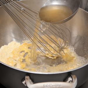 Prepare the soup: While the timbales are baking, heat the chicken stock in a medium saucepan over medium heat. Turn the polenta into a large heavy-bottomed saucepan lightly toast the polenta over low heat, stirring frequently, until it smells sweetly of corn but has not colored, about 10 minutes. Remove the pan from the heat and whisk the hot stock into the polenta 1 ladleful at a time, whisking well to keep the polenta smooth (fig. 6.1). Return the pan to the burner and cook over medium-low heat, whisking frequently, until the polenta thickens the broth and is soft but firm to the tooth, about 20 minutes (fig. 6.2). Do not allow the soup to approach a full boil. Add the lemon zest strips during the final 10 minutes of cooking. Season the soup with salt and pepper to taste. Remove and discard the lemon zest.