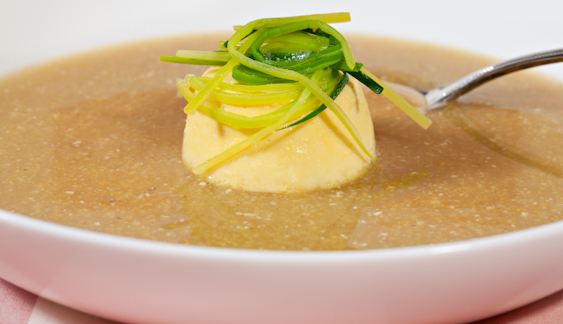 Alas, we couldn’t resist the urge to “chef up” this soup a bit. A custard timbale, infused with fresh leeks and a dash of curry, rests on a crisp garlic crouton, and is topped with a julienned poached leek salad. It is a light and soulful spring soup with flavors that provide comfort, a subtle surprise, and faint whispers of history.