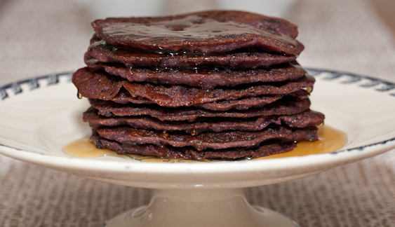 This batter is unleavened and will—indeed should—appear alarmingly thin. So, remember: the batter is thin and the griddle hot. If the griddle is hot enough, the batter will run out quickly into a wide, thin circle, the hot surface gripping and stopping the batter in its tracks. Once on the griddle, watch the color of the cornmeal on the uncooked side: it will turn from dusty mauve to deep purple as it cooks. Don’t turn the cake until its surface becomes dry on the edges. As you cook the cakes, you may want to thin the remaining batter with additional warm milk.