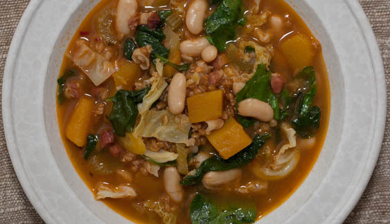 The minestrone we offer here is rather grand—almost orchestral—with all manner of offerings from the autumn harvest contributing to its richly layered texture and tastes. There is creamy winter squash, buttery cannellini beans, silky spinach, and a knob of parmesan oozing winsomely into the whole, all set against the backdrop of homemeade chicken broth and savory rendered pancetta. The farro confetti we throw into the mix provides an appealing counterpoint, drinking up vegetable flavors and bouncing around in our mouths!