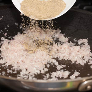 Meanwhile, spoon 2 teaspoons of the reserved fat into a 12-inch nonstick skillet and heat over medium-low heat until the fat melts. Add the shallots and seasoning mix (fig. 8.1) and sauté until softened and fragrant, about 2 minutes. Stir in the oats (fig. 8.2) and remove the skillet from the heat.