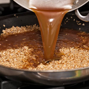 Measure out 18 ounces (2¼ cups) of the cooled stock reduction and pour it into the skillet (fig. 9.1). Stir well, and then spoon off any hulls that rise to the surface, taking care not to lose any broth in the process. Set the pan over high heat and bring the mixture to a simmer, stirring all the while. When the oats reach a simmer, reduce the heat to medium-low or low (depending on how hot your burner runs), and cover the skillet. Set a timer for 4 minutes; stir once or twice during that time, replacing the lid as quickly as possible. Remove the skillet from the heat and set a timer for 5 minutes to allow the oats to repose. After the 5 minutes, uncover the skillet and stir the oats. They should look moist, but have no excess liquid (fig. 9.2). Add the warmed meat and stir well to combine. Pack the mixture into an 8- by 4-inch loaf pan (fig. 9.3), smoothing and tamping with an offset spatula or the back of a spoon as you go. Let cool to room temperature, and then cover with plastic wrap and refrigerate overnight or up to 2 days.