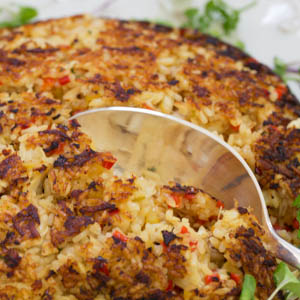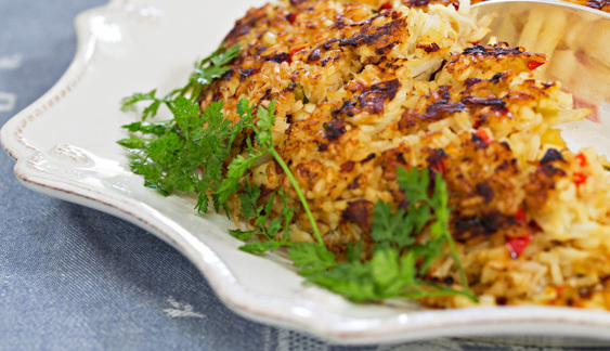 In Charleston, the term “pilau” (pronounced PUR-loh on location) describes any number of crisply contoured rice casseroles associated with white tablecloth celebrations and a high guest count. In times gone by, a pilau was cooked in three-legged upright cast- iron pot or potje over open flames and inverted—with difficulty, one imagines—onto a platter at the center of the table where it sat splendidly with its long, leggy rice spoon companion. The idea behind inversion was to showcase the outer burnish, while the long handle of the spoon allowed for self service without having to move the rice platter or having someone else serve you rice; the spoon’s deep bowl made excavation of both the crisp outer layer and moist grain-for-grain inner kernels simultaneously accessible. A Charleston pilau is more than simply rice, of course. It features game or seafood, as well as stock and aromatics that enhance those additions. We have been reluctant to tackle this old traditional dish owing to its unwieldiness, to say the least. But tackle it we did, for summer, with crab.