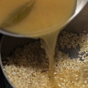 In a heavy-bottomed medium saucepan, warm 1 ounce (2 tablespoons) of the butter over medium heat. Add the rice and stir the grains until well coated with fat. Cook, stirring frequently, until the rice is opaque, about 5 minutes. Add the hot stock, bay leaves, lemon zest, Pernod, and ½ teaspoon of salt; stir to combine (fig. 3.1). Increase the heat to medium-high and bring to a simmer, and then decrease the heat to medium-low, cover the pan, and cook for 8 minutes, until the rice has absorbed the liquid. Do not open the lid during this time! Remove the pan from the heat and let stand for 1 minute.
