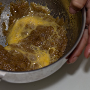 Add the pastry flour, baking powder, and baking soda to the cooled bennecake and whisk well to combine.