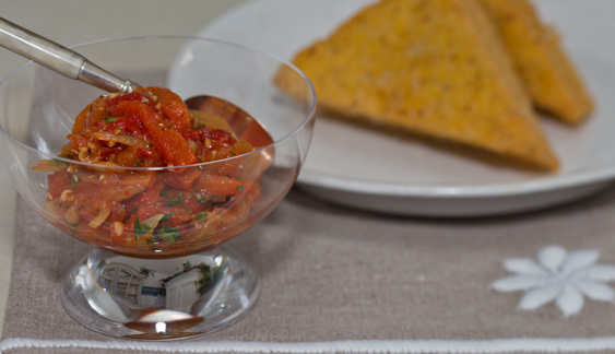 When the peppers are cool enough to handle, peel and discard the skins. If your peppers are very long, cut each piece in half crosswise, and then cut into ¼-inch-wide strips. Peel the tomatoes and dice them finely. Put the diced tomatoes into a fine-mesh strainer set over a bowl to allow excess juice to drain off.
