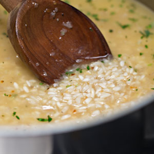Put the chicken stock in a small saucepan, cover, and bring to a simmer over medium-high heat. Turn the heat to low and keep the stock hot while you cook the risotto.