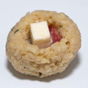 Using your index finger, poke a hole into the center of a risotto ball. Insert a slice of soppressata into the center, then a cube of cheese, then a second slice of soppressata (fig. 5.1). Enclose the cheese and soppressata in the rice; reshape the ball, this time forming it into a neat sphere; and return it to the baking sheet. Stuff the remaining risotto balls with the remaining cheese and the remaining sopressatta in the same way. Cover the baking sheet with plastic wrap and refrigerate for at least 1 hour, or for up to 24 hours.