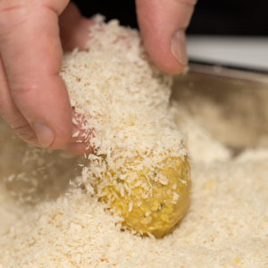 As for the magic we mentioned above, this recipe calls for smoked scamorza, a spun mozzarella-style cheese, because it happens to be particularly good with sopressatta (a dry Italian sausage). But, seriously, you don’t have to go with either one. A nice salami and fontina Val d’Aosta are perfectly capable of replacing them. For that matter, if you prefer cocktail-size arancini, skip the stuffing altogether! Either way, panko is the bread crumb of choice because it crisps up far better than your average fine bread crumbs.