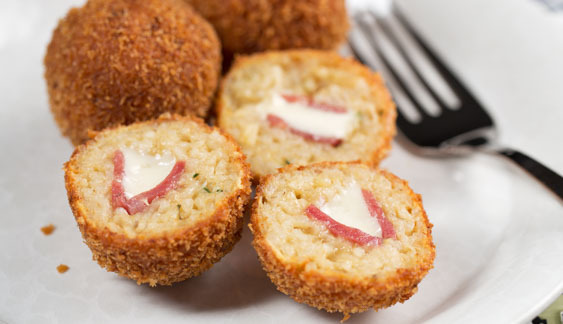 We like to think of arancini as crisp rice balls stuffed with magic. Beyond the panoply of meats, cheeses, and vegetables used to fill them, arancini burst with lore. Their name—which means “little oranges” in Italian—derives from the notion that when the egg used in the breading preparation carries a bright orange yolk, the arancini take on that hue and resemble little oranges after frying. Conceptually, arancini could be said to represent a cultural juxtaposition between the rice riches of Arabia and the martyrdom of Santa Lucia—a young woman sacrificed during Roman times for smuggling food to Christians hiding in the catacombs. Arancini became the totemic food for her feast day—the feast of Santa Lucia—which celebrates the Festival of Light on December 13. Myth has it that arancini represent the saint’s eyes. We think the Festival of Light a fitting metaphor for the flavor and texture of perfect arancini. Not so sure about the eyes. . .