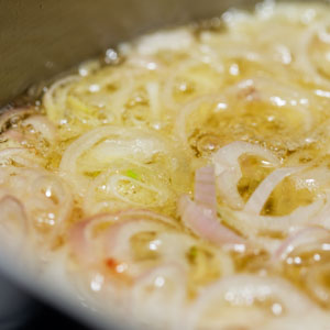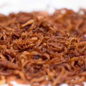 Nuance number three: fried shallots. Onions figure prominently in mujadara, but fried shallots transform it. Hot oil turns shallot slices into crisp onion candy. So delicious are they one could eat them straight from a bowl with a spoon, abandoning their garnish function altogether (and, shamefully, we have done this).
