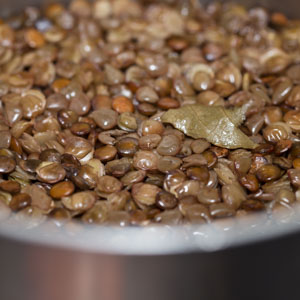 Cook the lentils: Bring the water, bay leaf, salt and oil to a boil in a medium heavy-bottomed saucepan over high heat. Add the lentils. Swirl the pan, reduce heat to medium-low, and cover tightly. Cook until the lentils have absorbed the water and are plump and tender, but retain a trace of firmness at their center, about 20 minutes. Remove from the heat and let the pot sit, covered, for 5 minutes (fig. 4.1). Discard the bay leaf.