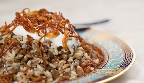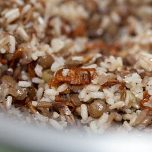 First, we chose Anson Mills Charleston Gold Brown Rice (brown because its bran layers and germ have not been polished away), a cross between Carolina Gold and a long-grain heirloom aromatic rice. Compellingly scented and delicately nutty, Charleston Gold Brown—which cooks up nearly white, by the way—also brings cheerful springy texture to the mujadara grouping and maintains its presence, in terms of flavor and texture, amid lentils, onions, and spice.