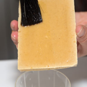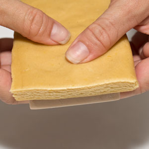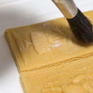 Line a baking sheet with a silicone mat or parchment paper. Using a pair of scissors, cut the bag away from the dough and divide the dough into three equal strips with a metal bench knife. Pull one strip aside and cover the other two with plastic wrap. Using the bench scraper, cut a piece of the dough to correspond with the shape but is slightly larger than the mold you intend to work with. Very lightly flour the surface of the piece of dough and invert it over the mold. Press the dough into the depressions with your fingers (fig. 3.1), and then pass a rolling pin over the dough, applying firm pressure (fig. 3.2). Invert the mold with the dough, and then lift the form away from the imprinted cookie (fig. 3.3). Cut around the edges of the design with the bench knife. Lay the cookie on the prepared baking sheet. Using a pastry brush, dust off excess flour from the surface (fig. 3.4) and brush the mold clean of any bits of dough or flour before forming additional cookies. Repeat this process with the remaining dough, working the scraps back in. Let the cookies dry, uncovered, at room temperature overnight.