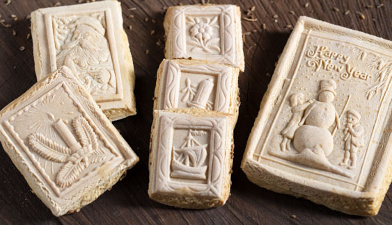 Americans in the upper Midwest probably bake more Springerle today than do most Germans. Yet these pale picture cookies in tablet form with their beautifully modeled surfaces, fine dryish crumb, and the spray of anise seeds stuck fast to the bottoms of their feet go back to the Middle Ages. In fact, archeological findings reveal that ancient Greeks and Romans embossed flatbread dough with molds made from stone and clay. The earliest Springerle in Germany and Switzerland were formed from molds depicting the pagan motifs—sunbursts, horses, cattle, and trees—and were offered to the gods at the celebration of the Winter Solstice. With the birth of Christianity, Springerle entered monasteries, where they joined Lebkuchen (already in progress). Indeed, the first monastic Springerle were made using Lebkuchen molds. Later, molds carved in the monasteries depicted Christian motifs such as angels, St. Nicholas, oxen and donkeys, Mary and Joseph, and the baby Jesus.