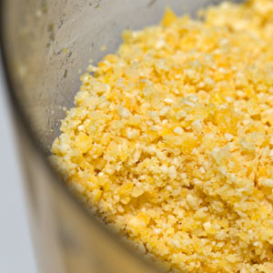 Turn the hominy into a food processor and pulse until you have the texture of coarse grits (fig. 1.1). How long this takes will depend on whether you begin with hot or cold hominy—cold hominy can take up to thirty-five 1-second pulses but hot hominy will break down much more quickly.