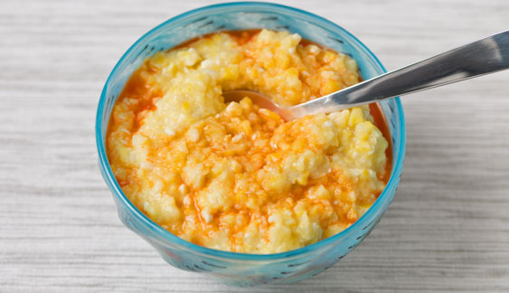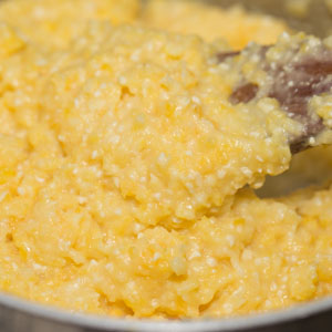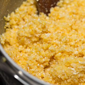 The hominy must be hot and hydrated before it is creamed out with the butter. In the saucepan, the kernels will swell and become slightly creamy. At that point, it is safe to stir in the butter.