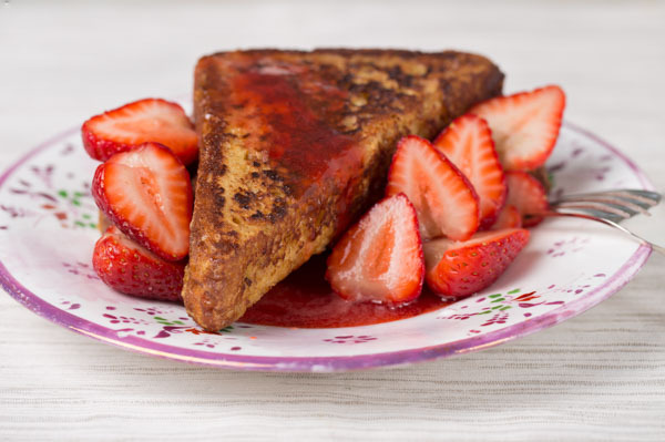 We use no sugar in the custard and instead like to sprinkle the bread lightly with sugar before frying it to exaggerate its outer crispness that much more. If maple syrup appeals to you more than our strawberry syrup option, you might choose to eliminate the sugared surfaces.\r\n
