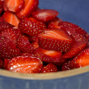 When you are ready to serve, in a small, dry skillet, toast the reserved almonds over medium heat, shaking the pan frequently, until deep golden brown and richly fragrant, about 10 minutes. Transfer to a cutting board and let cool, and then mince them as finely as possible (fig. 3.1). While the almonds cool, hull and slice the strawberries. Turn them into a medium bowl, add the 2 tablespoons sugar, and toss to combine. Let stand at room temperature, tossing occasionally, until the berries are softened and juicy and the sugar is mostly dissolved, about 10 minutes (fig. 3.2).