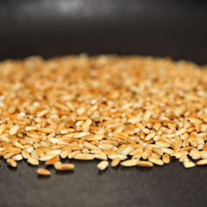 In an electric coffee grinder dedicated to spice-grinding, pulse the toasted rice to a coarse powder, 3 or 4 pulses. Return the rice to the bowl. Break the stem off the toasted chiles and shake out the seeds; break the pods into small bits and add them to the grinder. Process the chiles, vigorously shaking the grinder, until you have a slightly coarse powder. Tip the chile powder into a second small bowl (fig. 2.1).