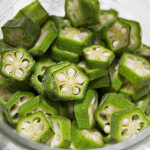 Fresh raw okra sliced and put in touch with just a few drops of rice vinegar becomes a vibrant salad component here—think garden, not gumbo. It is important that the okra be slim and young and feel yielding, not stiff to the touch.