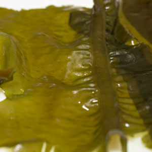 In a small bowl, soak the wakame in water to cover for 5 minutes, and then drain. Bring a small saucepan of water of boil over high heat. Drop the seaweed into the water, lower the heat slightly, and simmer the wakame until softened, 2 to 3 minutes. Drain and transfer to paper towels. Now rehydrated, the wakame strips will unfurl into ragged sheets (fig. 5.1). Trim the wakame to create planks, and then slice the planks into ⅛-thick-wide strips. Trim the strips into 3-inch lengths (fig. 5.2).