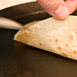 Peel off the top layer of plastic, then drape it back lightly over the dough. Flip the entire package so the bottom sheet of plastic becomes the top and peel off the top layer of plastic. Lightly coat the griddle with nonstick cooking spray, then blot the excess with paper towels. Position the rolling pin across the top third of the tortilla and use the bottom plastic to drape the dough up onto the pin (fig. 7.1). Gently peel the dough off the plastic, allowing it to drop onto the rolling pin (fig. 7.2), then, using the rolling pin, lift the tortilla off its plastic backing. Lower the tortilla onto the griddle, near the edge to make sure the entire tortilla will fit; let the tortilla grip the griddle upon first contact (fig. 7.3). Unfurl the tortilla across the griddle. If necessary, use the tip of a small offset spatula to pull the dough gently into shape. (If the tortilla is hopelessly wrinkled, simply let it cook.) After about 15 seconds, check the bottom of the tortilla for browning (fig. 7.4). If it is spotty golden brown, flip the tortilla, pressing to smooth the round if needed. The surface should have appealing brown spots and blisters. Cook until the second side is spotty brown, about 10 seconds; you may now flip the tortilla at will to cook and brown it further, though tortillas destined for quesadillas or other applications where they’ll see heat again should be kept supple and not allowed to become crisp.
