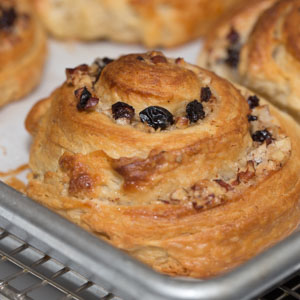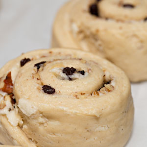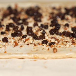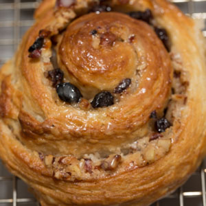Schnecken, as their shape suggests, represent snails. Schnecken are made by rolling raw ripened Danish dough into a thin square sheet, then, in our variation, spreading the surface with a fluffy butter and sugar concoction called remonce. Currants and pecans are strewn lavishly on top, and the dough is rolled into a long cylinder like a carpet. Danes deploy remonce in nearly all Danish fillings owing to the cushion of moisture, flavor, and grip it offers the already extravagant dough and filling. Cut into thick pinwheel rounds, schnecken are set to proof. Once baked, schnecken are moist within, crisp without, and carry the flavors of chopped pecans and rum-doused currants into the flaky folds of a well-fermented, high-performance pastry.