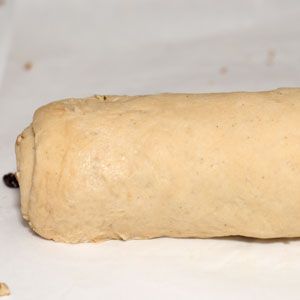 Using a small offset spatula, spread half of the remonce in a smooth, even layer on the dough, leaving a 1-inch wide border across the far edge of the dough. Sprinkle evenly with half of the currants and half of the pecans (fig. 7.1). Starting at edge nearest you, roll the dough jelly roll–style to form a log 12 inches long and 2 inches in diameter (fig. 7.2). Roll the log so that the seam is on the bottom. Using an electric knife or a sharp serrated knife, cut the log into ten sections of even thickness. One at a time, place the pieces cut side-up on one of the parchment-lined sheet pans, tucking the free end underneath (fig. 7.3); space the pieces evenly apart. Flatten each one lightly with the palm of your hand. Invert one of the unlined half sheet pans over the filled pan, forming a proofing box, and let the schnecken rise until they are nearly doubled in size, about 2 hours (fig. 7.4). About 30 minutes into the rising, repeat the process with the remaining dough, remonce, currants, and pecans.
