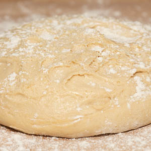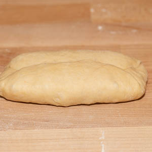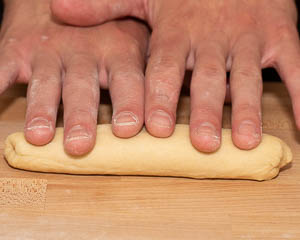 Cut a strip about 2 inches wide from the dough (fig. 2.1), then cut a square off that strip. Weigh the square—you’re aiming for a 70-gram piece. Trim off a bit if it’s too large, or add a sliver if it’s too small. Set the piece on a lightly floured area of your work surface. Cut another nine 70-gram portions of dough, for a total of ten. You will have about 200 grams of leftover dough; discard it or divide it in half to make a couple of hamburger buns.