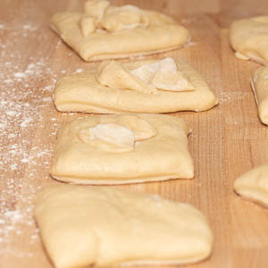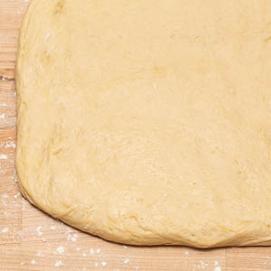Lightly flour your work surface. Remove the plastic wrap from the bowl and dust the surface of the dough with flour. Run a plastic bowl scraper around the edges of the dough to release it from the bowl, then invert the bowl, allowing the dough to drop onto the floured surface. The dough will be very puffy, a sign of healthy fermentation. Sprinkle the dough with flour (fig. 1.1) and pat with your hands to de-gas thoroughly. Stretch the dough into a rough 10-inch square (fig. 1.2).