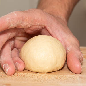 Place one piece of dough on an unfloured area of your work surface and fold it in half on the diagonal. Cup your hand around the dough and move your hand in a small circular motion, dragging the dough along and allowing its bottom to grip the work surface. Continue to “round” the dough until it forms a compact ball with a smooth, taut surface and a sealed bottom (fig 3.1). Set the round on a lightly floured area of your work surface, then repeat with the remaining 70-gram portions of dough. Cover the rounds with a clean kitchen towel and let rest for 15 minutes. If you are making hamburger buns with the extra dough, shape those portions in the same way, then place on a parchment paper–lined baking sheet and cover lightly with a piece of plastic wrap sprayed with nonstick cooking spray.